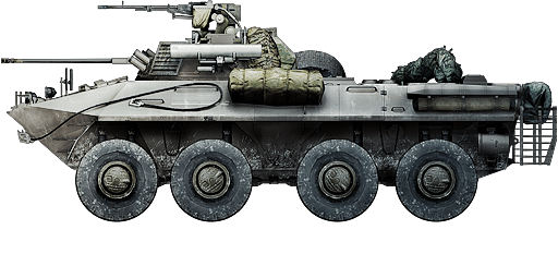 Russischer gepanzerter Personentransporter mit Rädern. Der BTR-90 ist größer und besser ausgerüstet als sein Vorgänger und kann dem Einschlag von 14,5mm-Projektilen standhalten.
