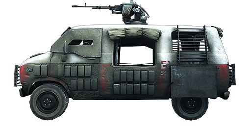Modifizierter Van mit fernbedientem Turm und offenen Beifahrersitzen.