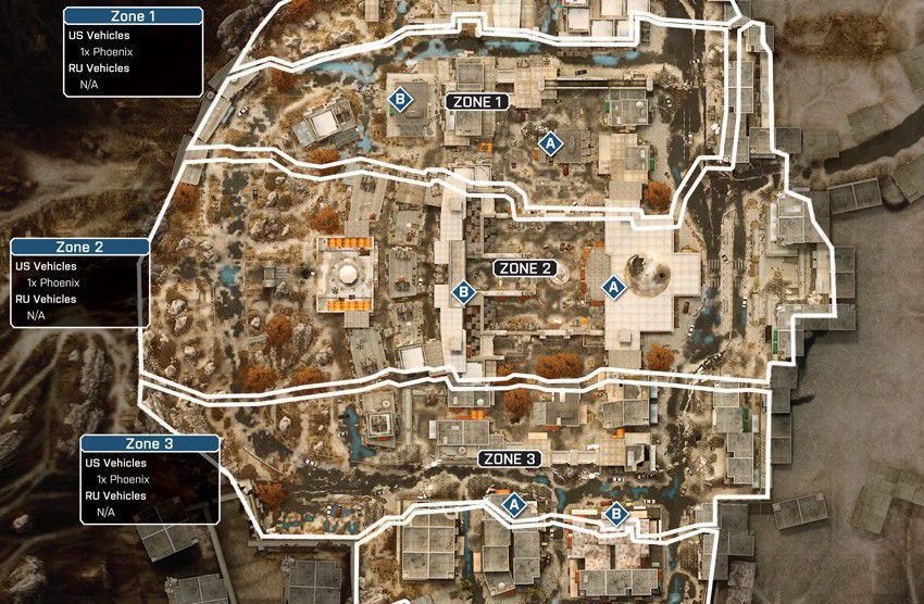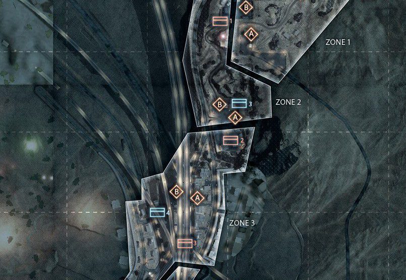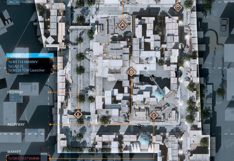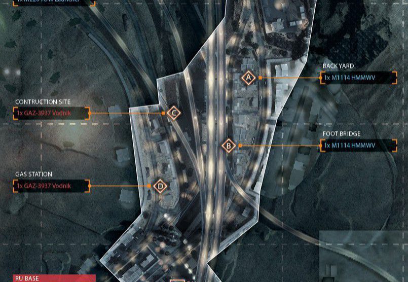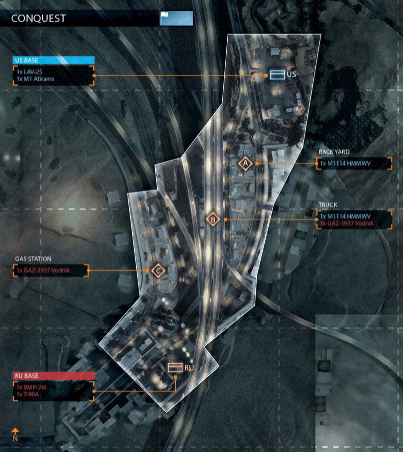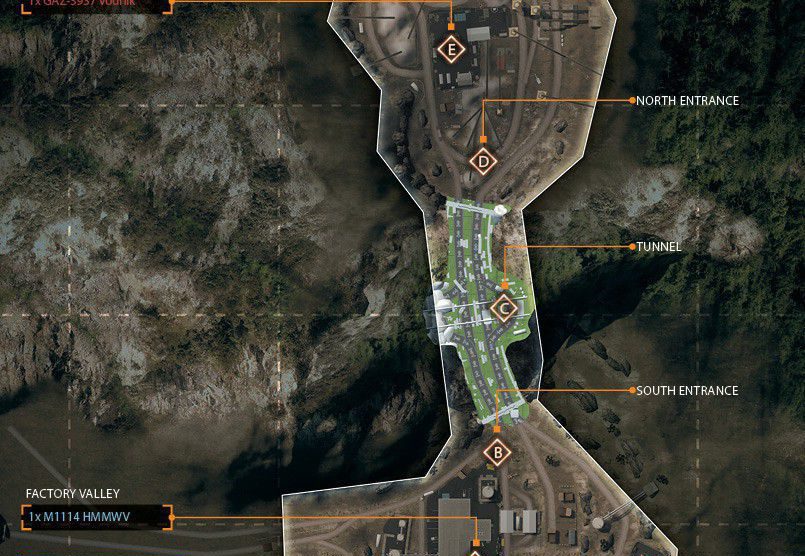 Eine der Inspirationen für diese Karte stammt von einem Foto von Teheran in der Nacht. Man startet in den Bergen und arbeitet sich bis zur Stadt durch. Die Nachtkarte hat bietet einen guten Mix aus Fahrzeugen und Infantrie. Es startet mit einem großem Raum für Fahrzeuge und endet mit weniger Fahrzeugen und einem