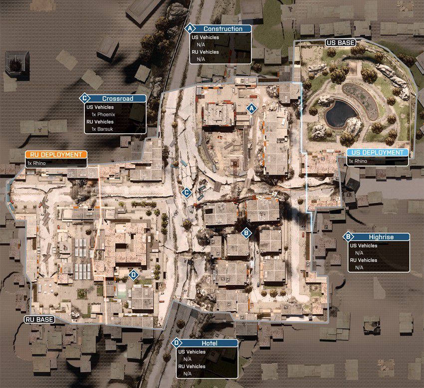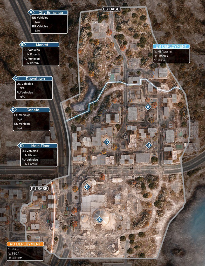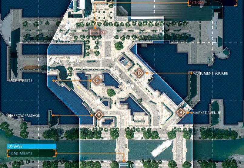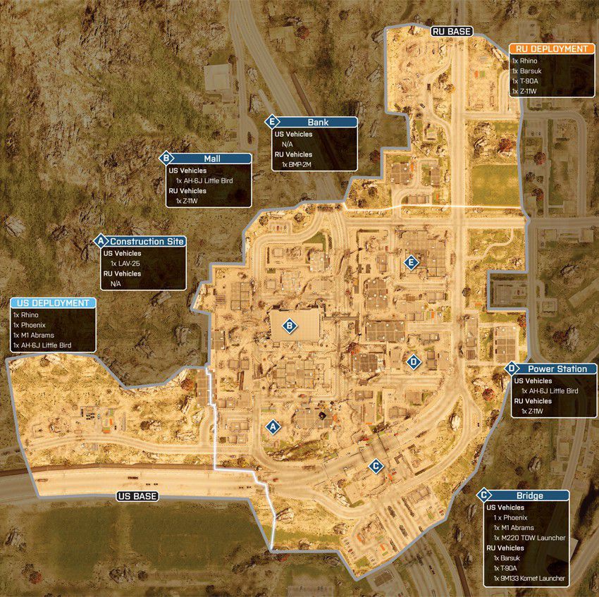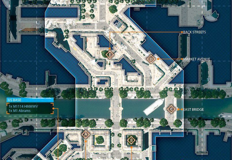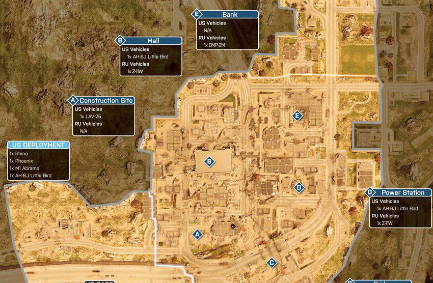 Das Szenario dieser Karte spielt sich in einem völlig verwüsteten Bankenviertel ab. Das Gefecht soll sich auf dieser Karte um ein hohes Gebäude, welches mittig positioniert ist, drehen. Um das Gebäude herum gibt es eine große Stadt.
