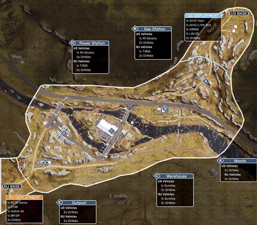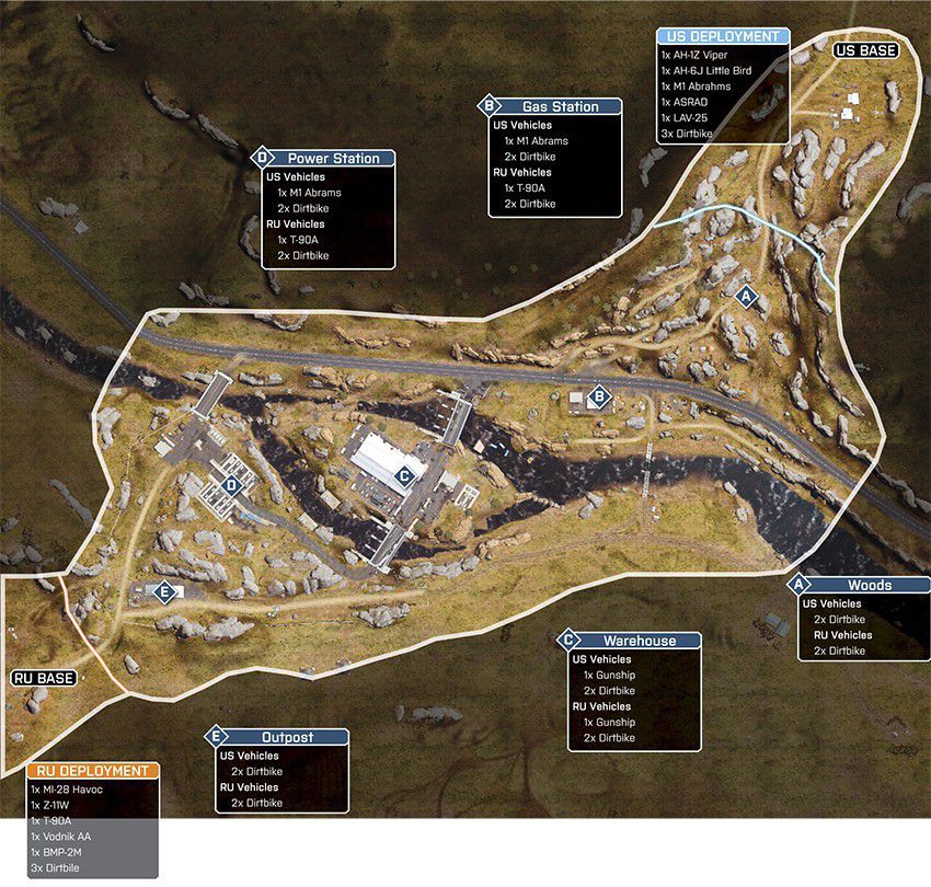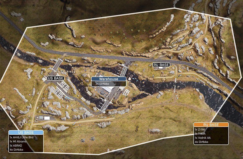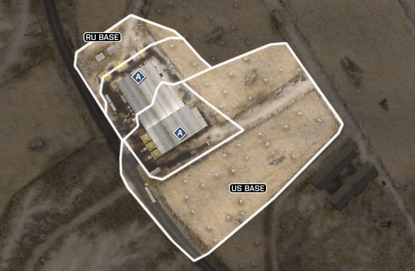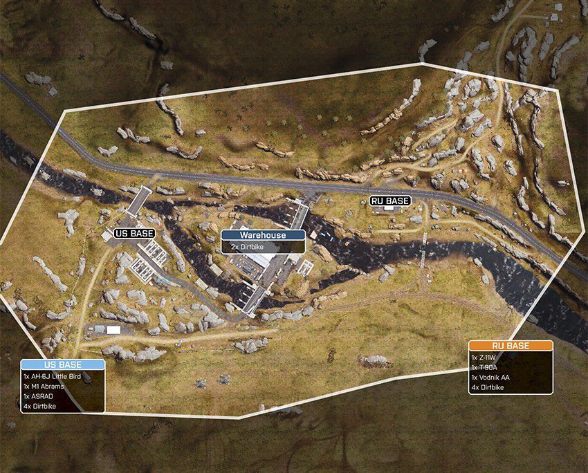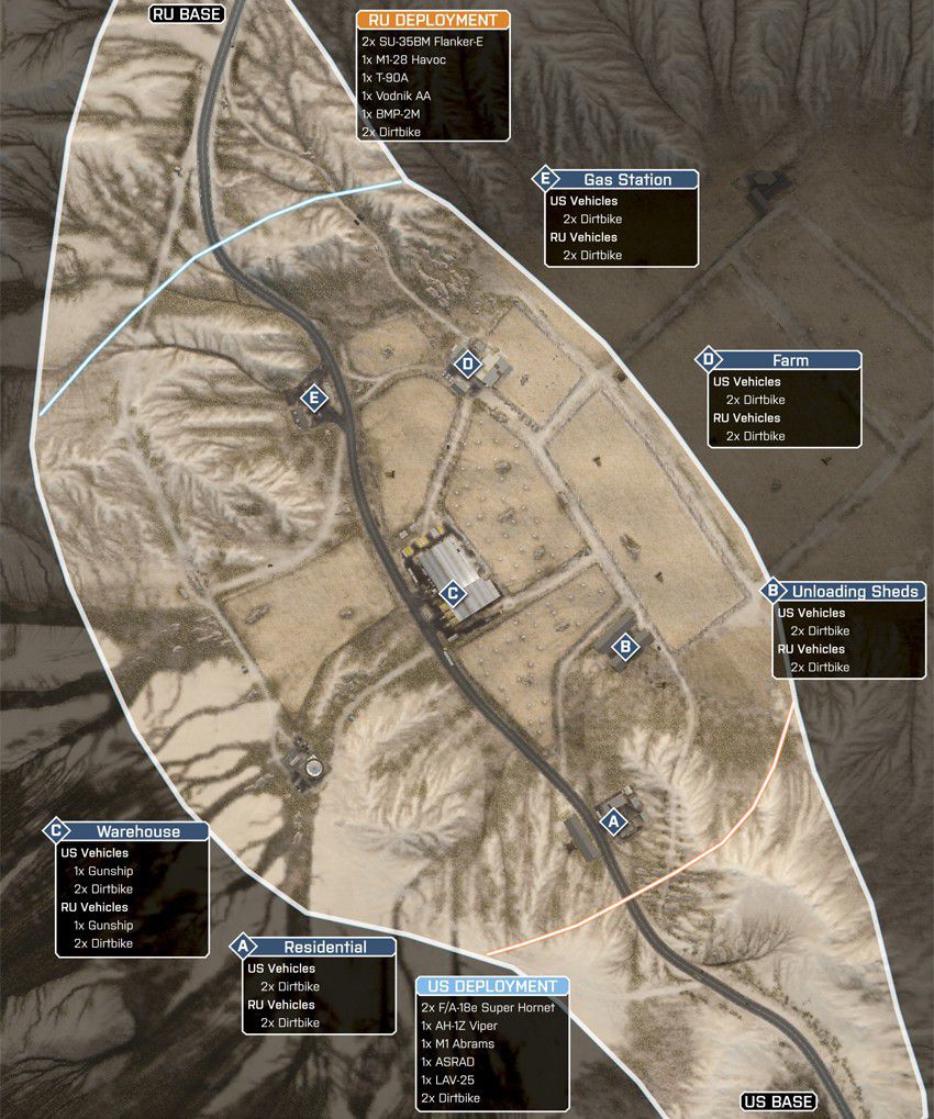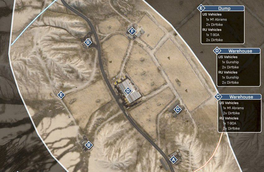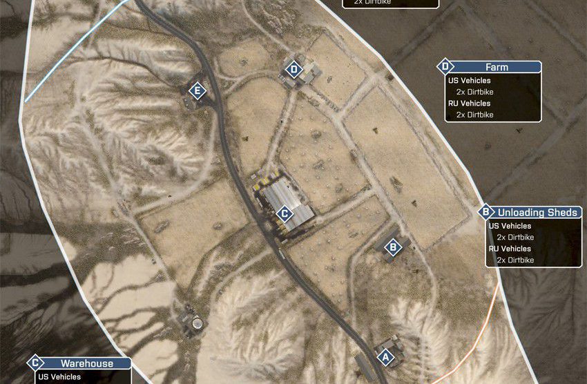 Eine offene Wüstenkarte um ein geheimes Waffen- und Munitionsdepot herum. Da das umliegende Gebiet relativ offen ist, ermöglicht das vielerlei Bewegungen mit den verfügbaren Multiplayer-Fahrzeugen. Das Wüstenterrain bietet wenig natürliche Deckung, es wird also ein schneller Transport zwischen den Kontrollpunkten nötig sein.