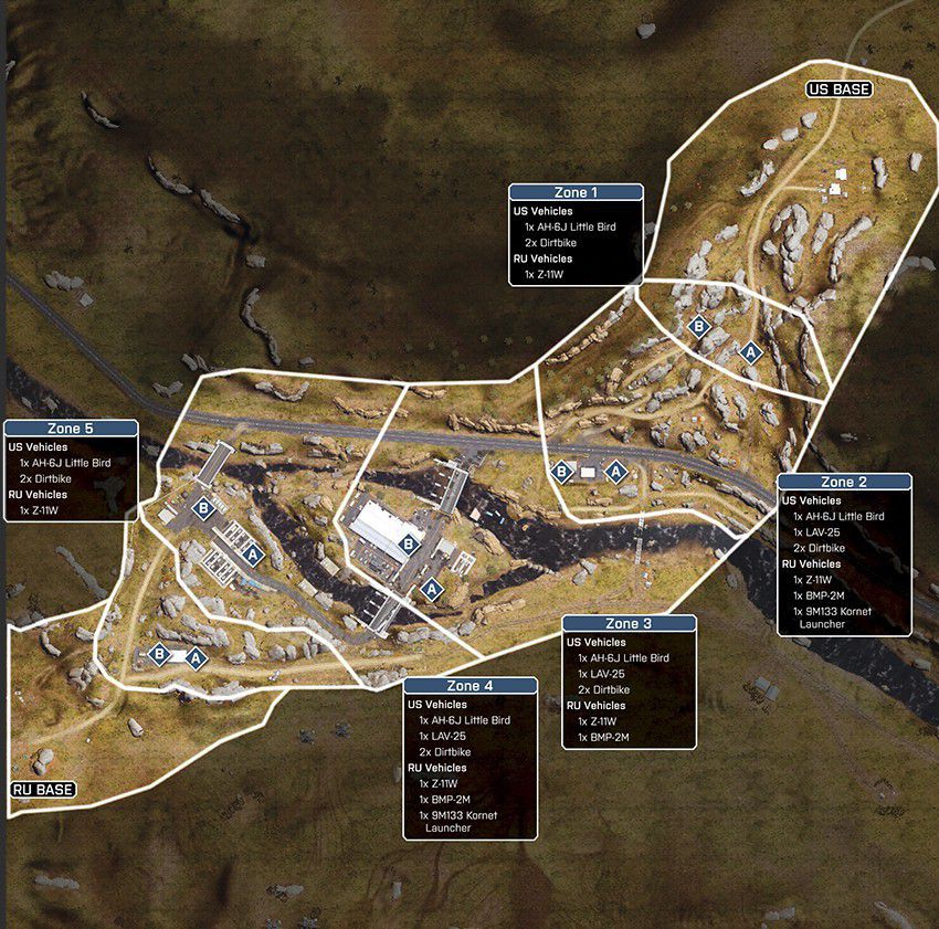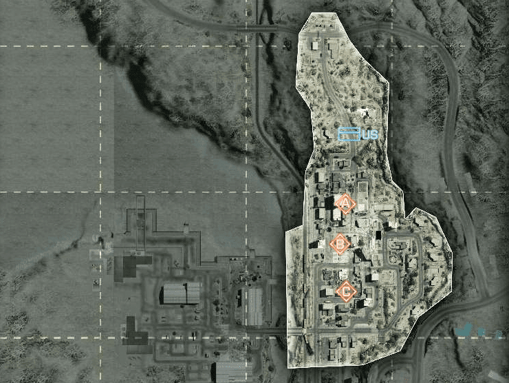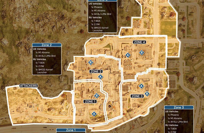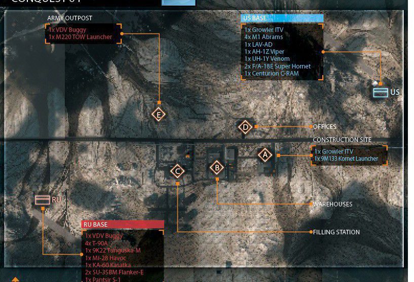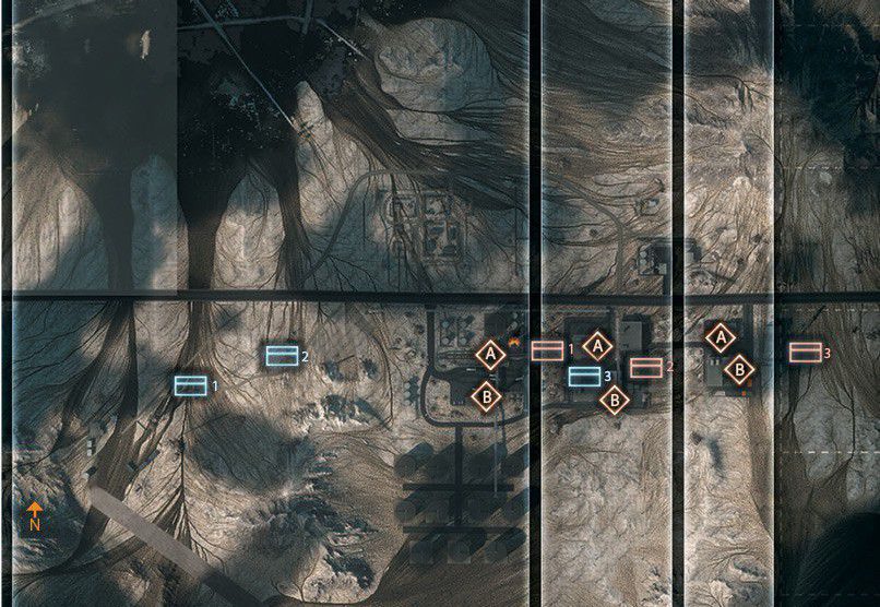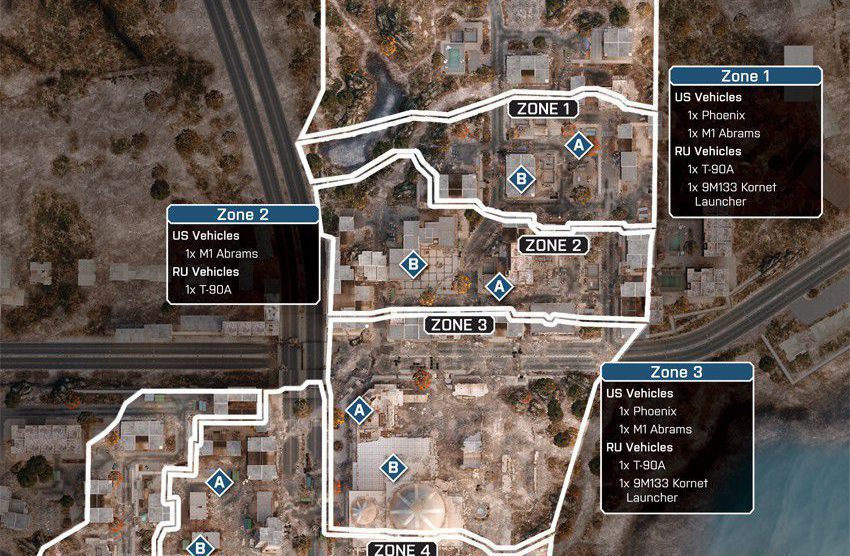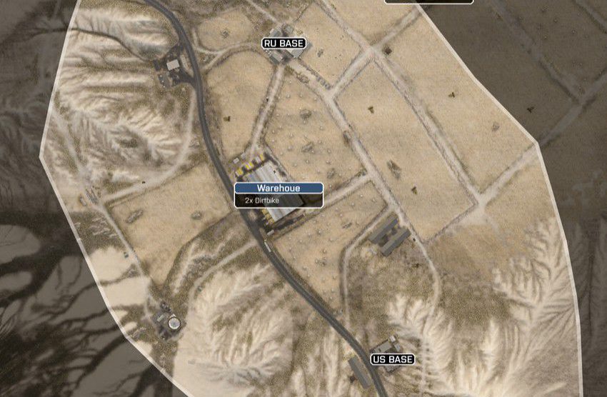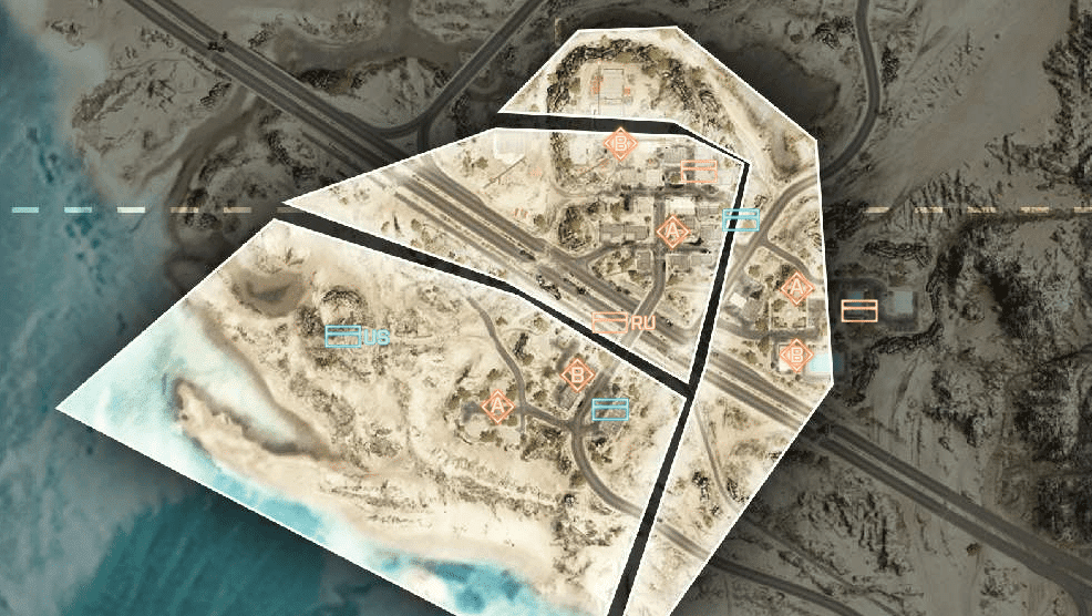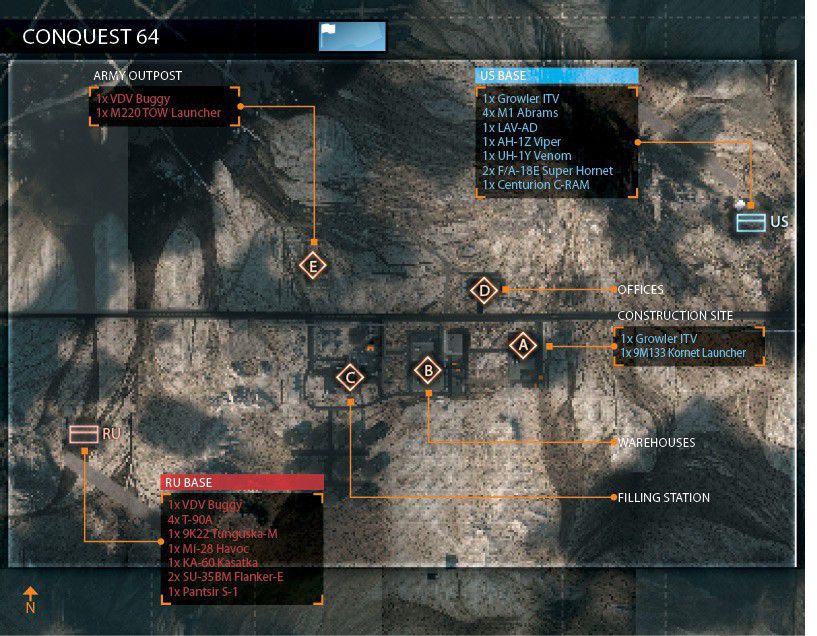 Eine offene Wüstenkarte um ein geheimes Waffen- und Munitionsdepot herum. Da das umliegende Gebiet relativ offen ist, ermöglicht das vielerlei Bewegungen mit den verfügbaren Multiplayer-Fahrzeugen. Das Wüstenterrain bietet wenig natürliche Deckung, es wird also ein schneller Transport zwischen den Kontrollpunkten nötig sein.