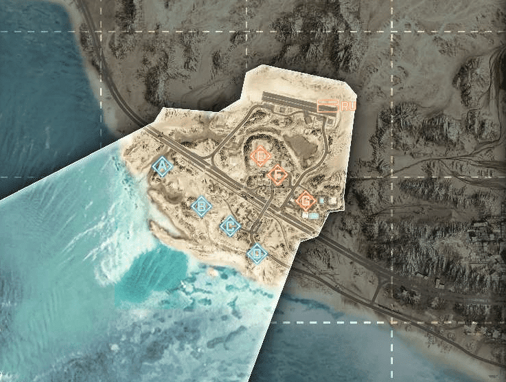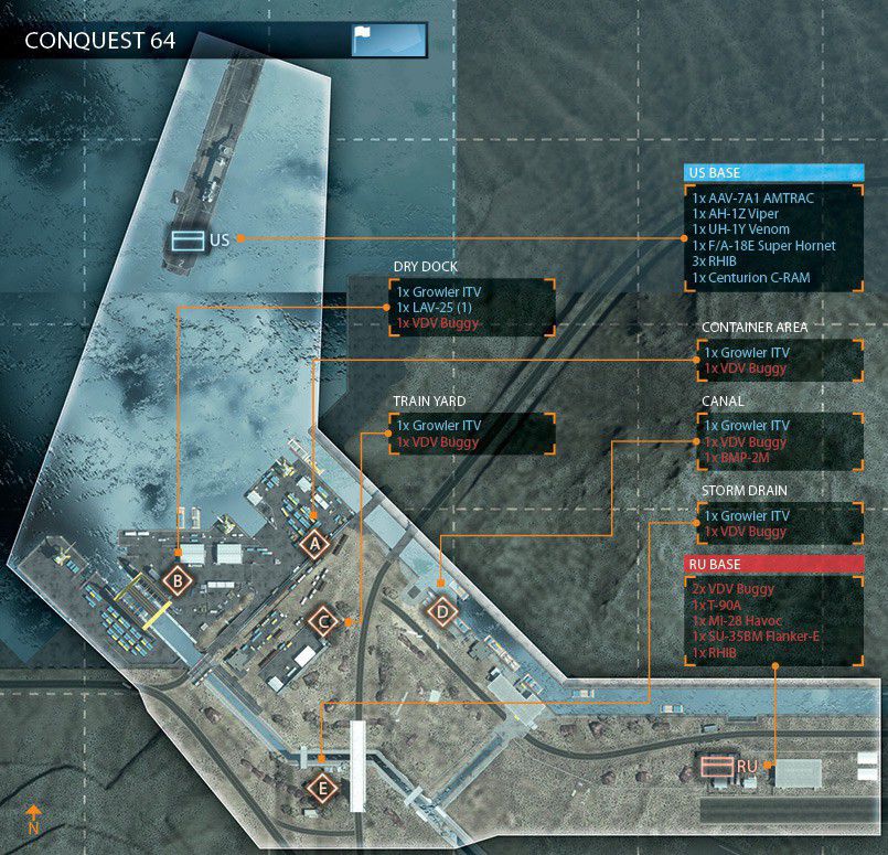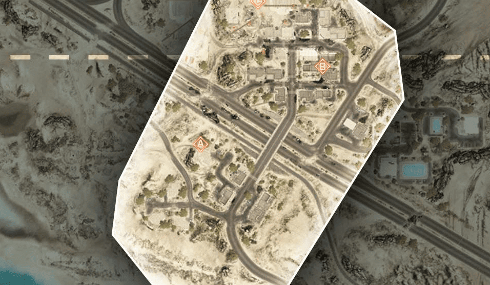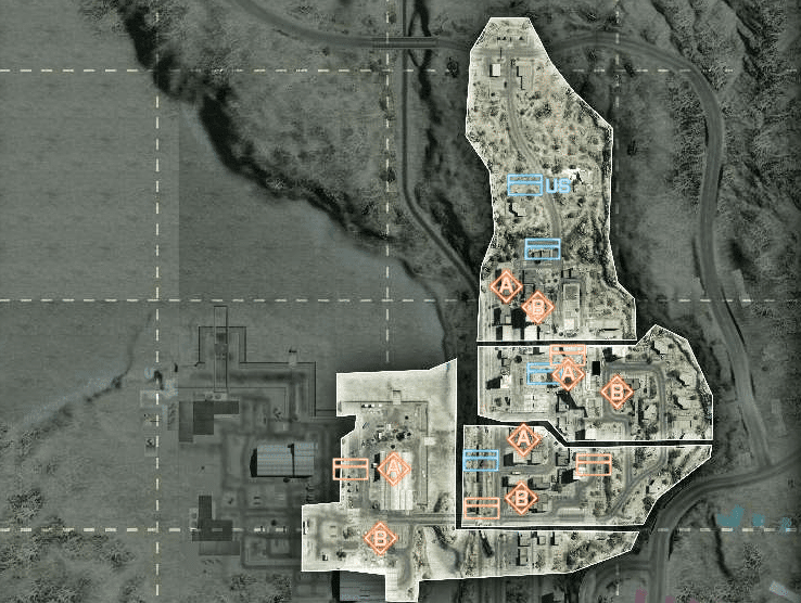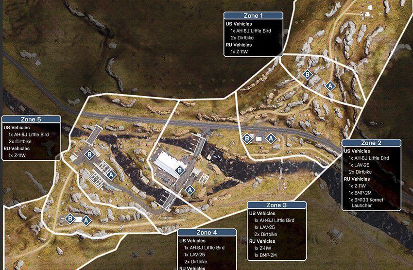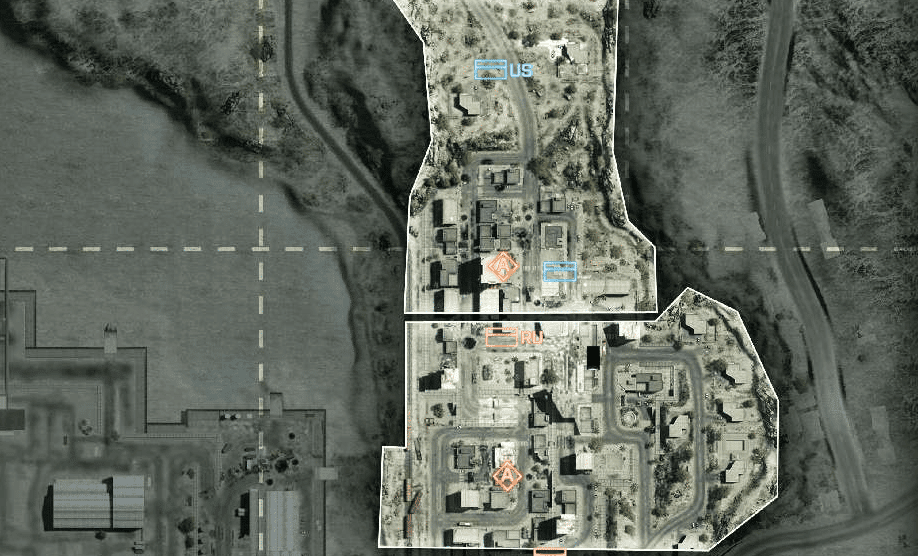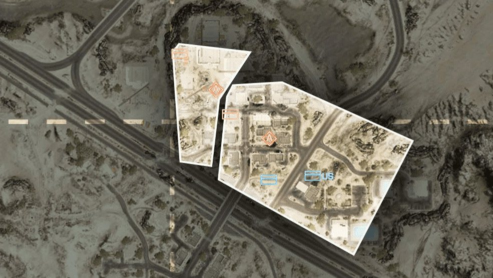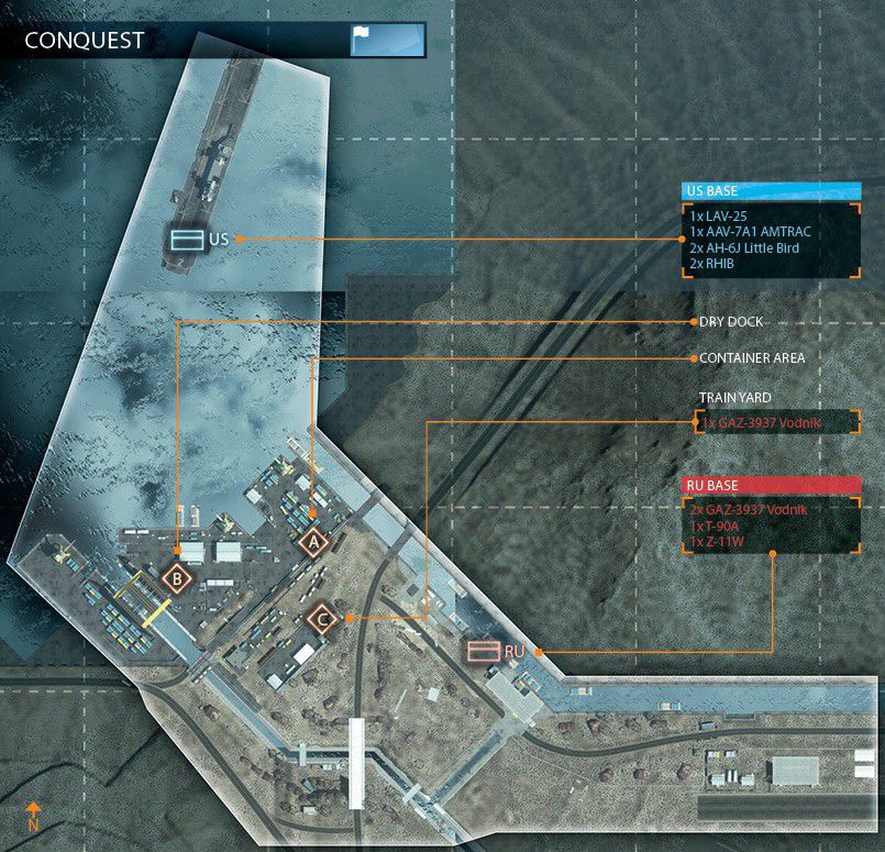 Eine offene Wüstenkarte um ein geheimes Waffen- und Munitionsdepot herum. Da das umliegende Gebiet relativ offen ist, ermöglicht das vielerlei Bewegungen mit den verfügbaren Multiplayer-Fahrzeugen. Das Wüstenterrain bietet wenig natürliche Deckung, es wird also ein schneller Transport zwischen den Kontrollpunkten nötig sein.