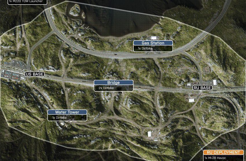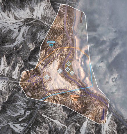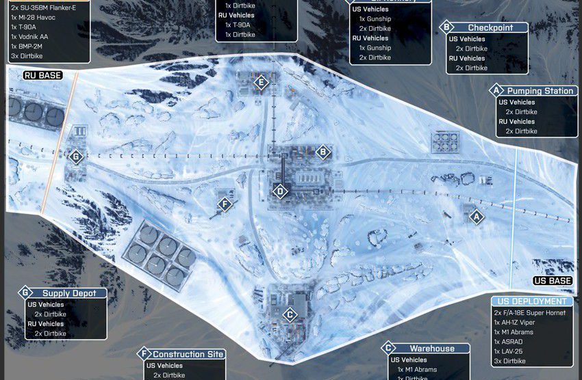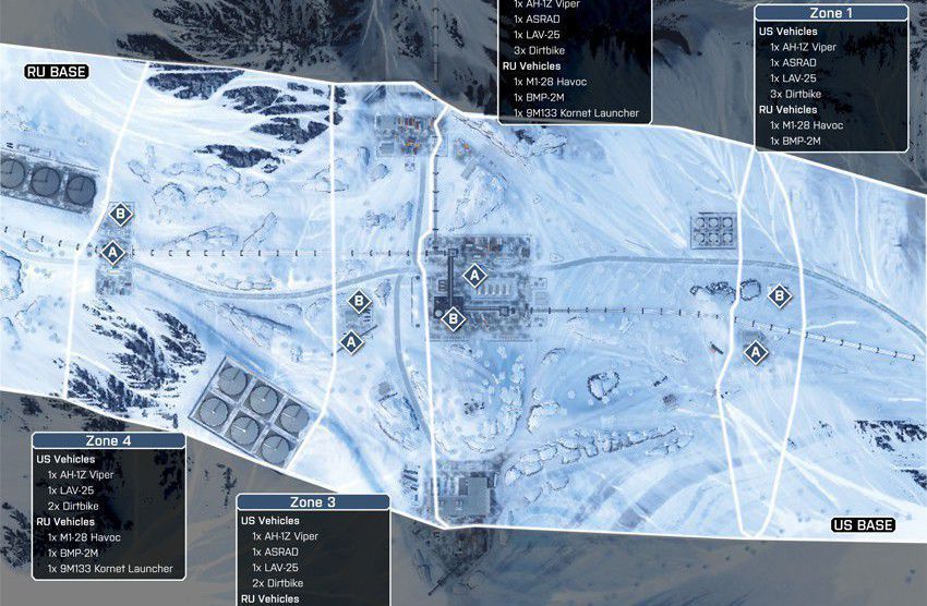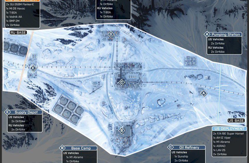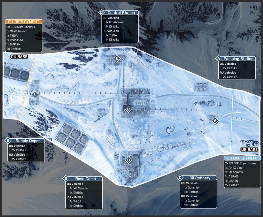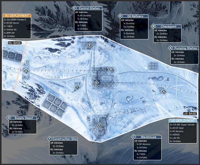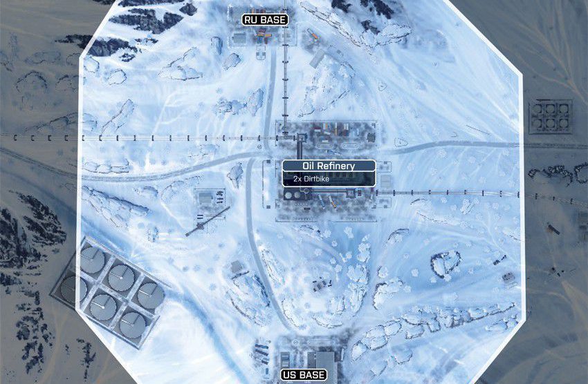Diese Karte ist in einer winterlichen Bergumgebung angesiedelt, in deren Mittelpunkt eine Pipeline-Basis ist. Die Karte ist so angelegt, dass du dich zu Fuß und mit dem Fahrzeug über die schmalen Straßen und unebene, schneebedeckte Oberflächen vorarbeiten musst.