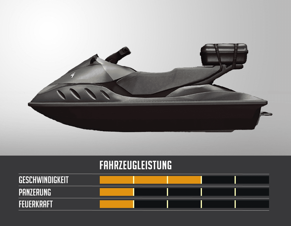 | Das PWC ist sogesehen die Wasserversion des Quadbikes. Es ist zum schnellen Transport von zwei Soldaten vorgesehen. Während der Fahrer keine Waffe zur Verfügung hat, kann der Beifahrer aber zumindest die mitgetragenen Waffen nutzen. |