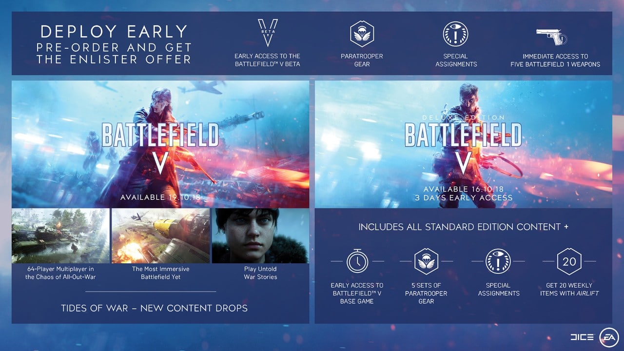 EA bietet auch in diesem Jahr allen Spielern zwei Möglichkeiten bei Battlefield V dabei zu sein. Zum einen eine Standard und zum anderen eine Deluxe Edition sowie ein spezielles Enlister-Angebot, welches alle Spieler erhalten, wenn sie die Battlefield V Standard oder Battlefield V Deluxe Edition vorbestellen.