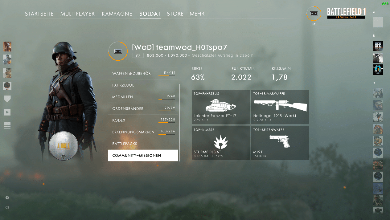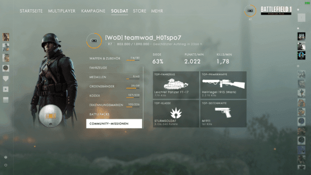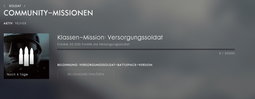 Ihr könnt den Status und die Belohnung im Battlefield 1 Missions Tracker abholen. Ihr findet den Missions Tracker im Hauptmenü von Battlefield 1 unter dem Menüpunkt „Soldat“. Scrollt dort etwas nach unten und klickt dort auf „Community -Missionen“. Ihr könnt in diesem Menü den aktuellen Status als auch den Reward abholen, indem ihr auf „Clain Reward“ / „Belohnung einlösen“ klickt.
