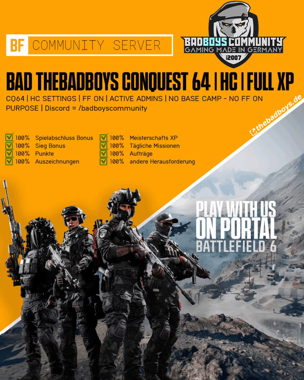 Seit mittlerweile über 17 Jahren ist die BadBoys Community ein Zuhause für Battlefield-Spieler, die mehr wollen als nur ein schnelles Match.Was einst als kleine Gruppe begeisterter Gamer begann, hat sich zu einer der beständigsten und engagiertesten Communities weltweit entwickelt. 🌍💪Über all die Jahre hinweg haben wir in nahezu jedem Battlefield-Teil eigene Server betrieben – und das mit großem Erfolg:Unser Hardcore-Server gehörte regelmäßig zu den bestplatzierten weltweit 🏆 und wurde von Spielern aus allen Ecken der Welt besucht. 🌐