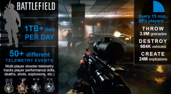 EA´s Chief Technology Officer Rajat Taneja gab heute bekannt wie viele Daten während eines ganz normalen Battlefield 3 Spieltages aufkommen. Zu erwähnen ist, dass dies nur die Daten sind, die EA auch speichert. Insgesamt 1 Terabyte sollen an einem Spieltag aufgezeichnet werden. In diese gigantische Datenmenge spielen mehr als 50 verschiedene Aktionen ein, die sowohl Kills, Deaths, Explosionen, abgefeuerte Schüsse etc. sein können.