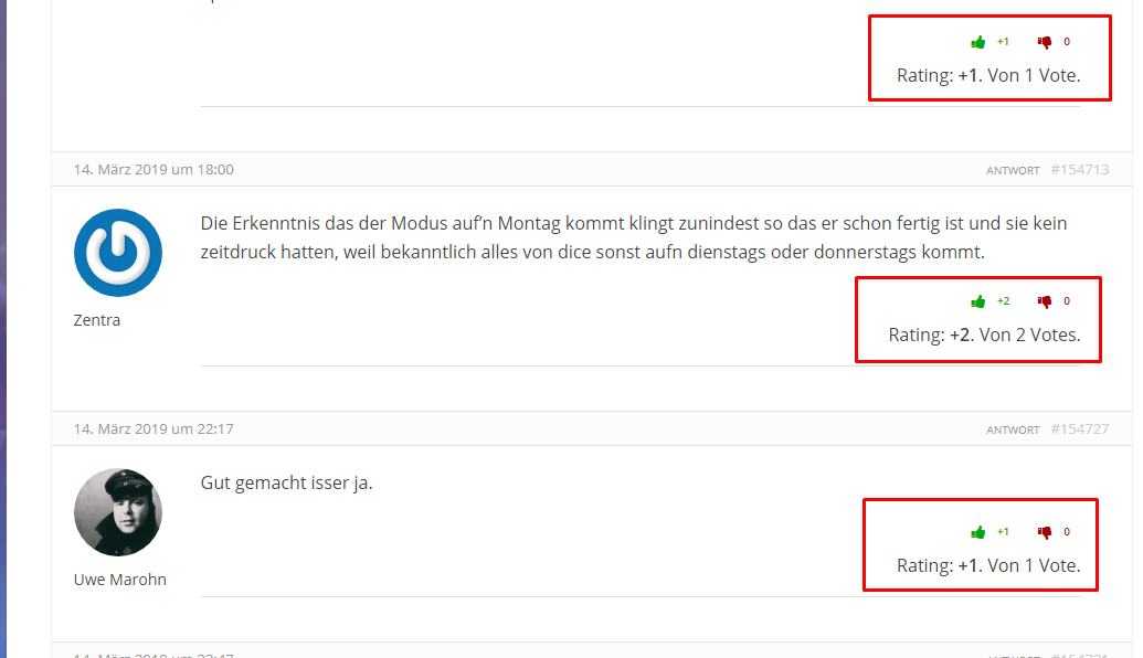 • Wir testen ein neues Feature zur Bewertung der Kommentare. Danke / Thanks passt nicht wirklich immer oder fast nie. Daher kann nun unter jeder Antwort ein Daumen hoch oder runter gemacht werden.